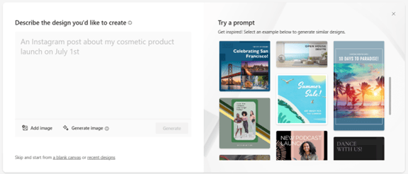 The first prompt it asks is “Describe the design you’d like to create.” This makes it simple for someone with no design experience to use it. Based on your prompt, the system can leverage AI to generate graphics. You can also upload your own.